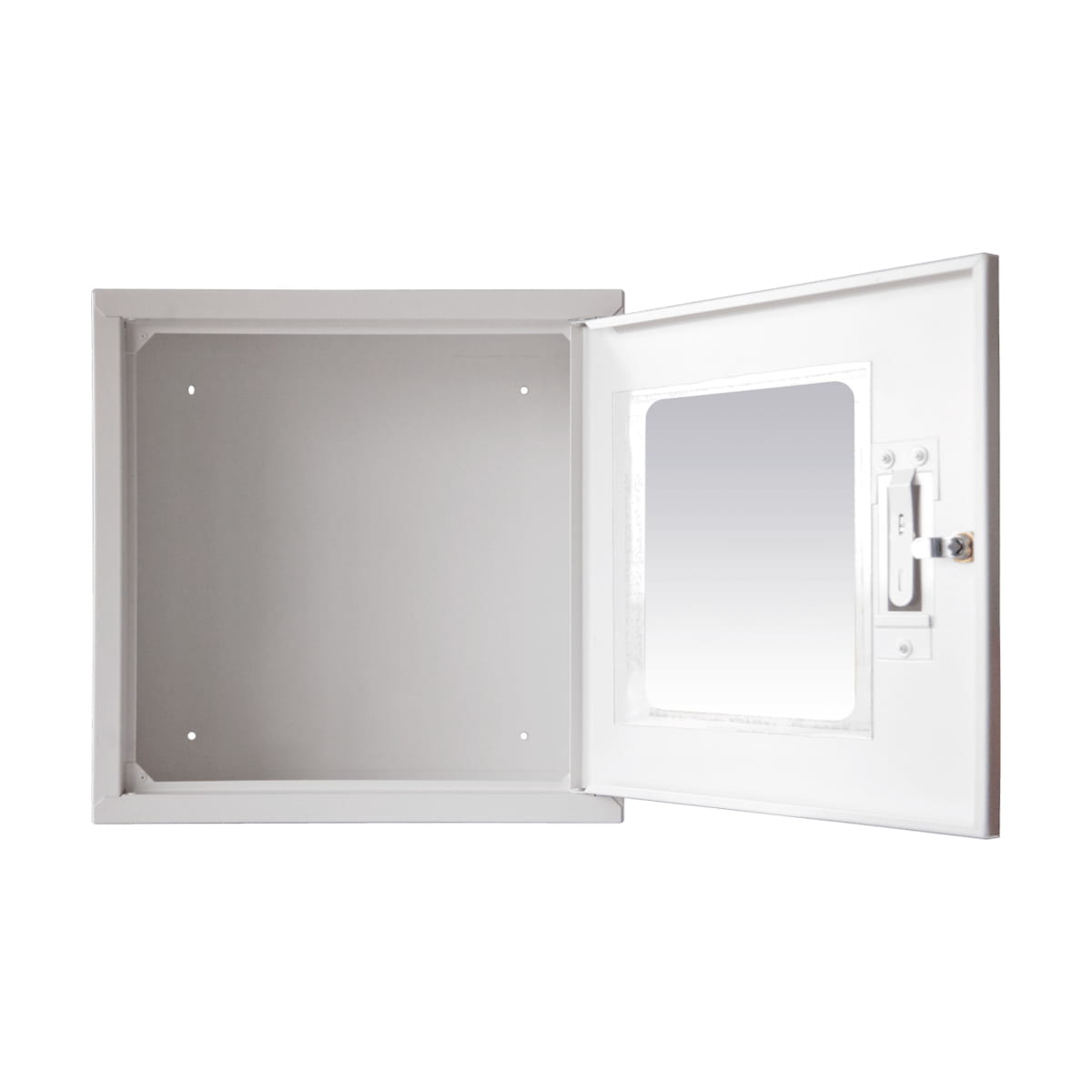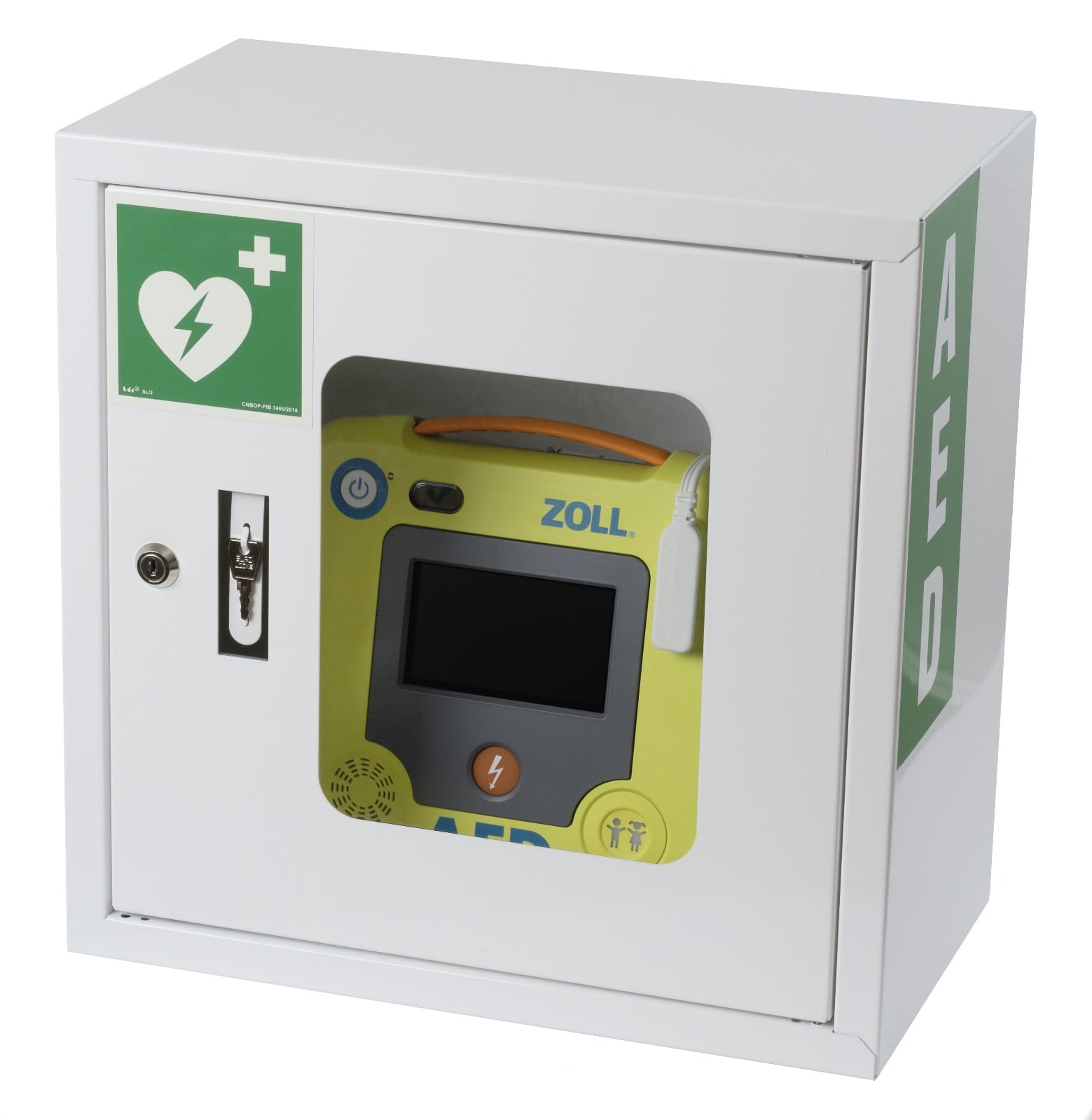 Metalowa szafka wykonana ze stalowej blachy, która jest malowana proszkowo na kolor biały. Szafka została wyposażona w system "zbij szybkę", która umożliwa zabezpieczenie defibrylatora. Szafka jest wyposażona w okienko inspekcyjne wykonane z wytrzymałego PLEX. Dodatkowa doposażyliśmy szafkę w alarm dźwiękowy mocowany na stałe metodą zgrzewania.